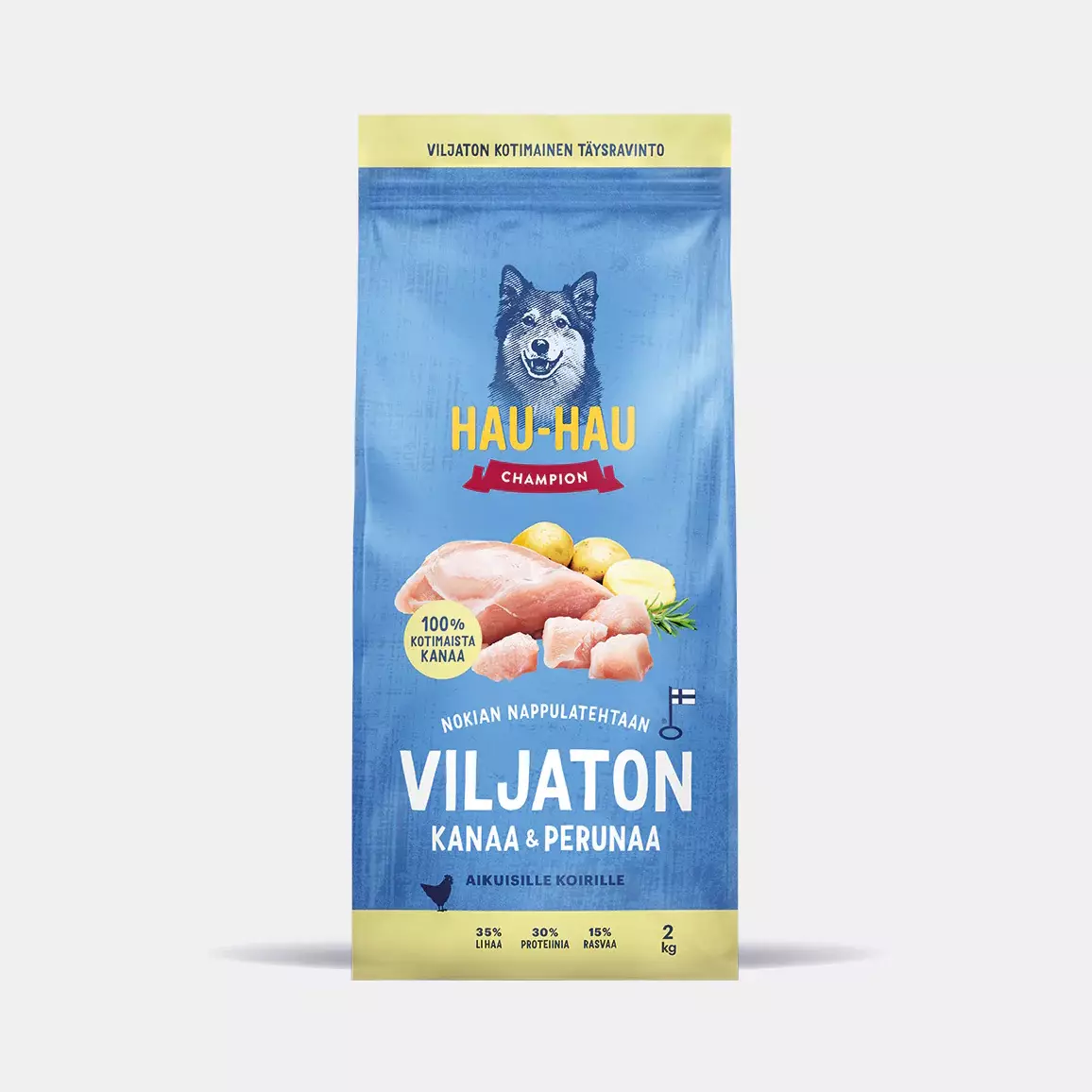 Kotimainen, viljaton kuivaruoka herkkävatsaisille koirille. Hau-Hau Champion Viljaton Kanaa & perunaa on lihaisa ja maukas koiran täysravinto, josta löytyy kaikki koiran tarvitsemat ravintoaineet sopivassa suhteessa. Täysin viljaton koiranruoka voi olla ratkaisu koirille, joilla on herkkä vatsa, ruoansulatusongelmia tai allergioita. Siksi olemme suunnitelleet tämän kuivaruoan erityisesti herkkävatsaisille ja viljoille herkistyneille koirille.