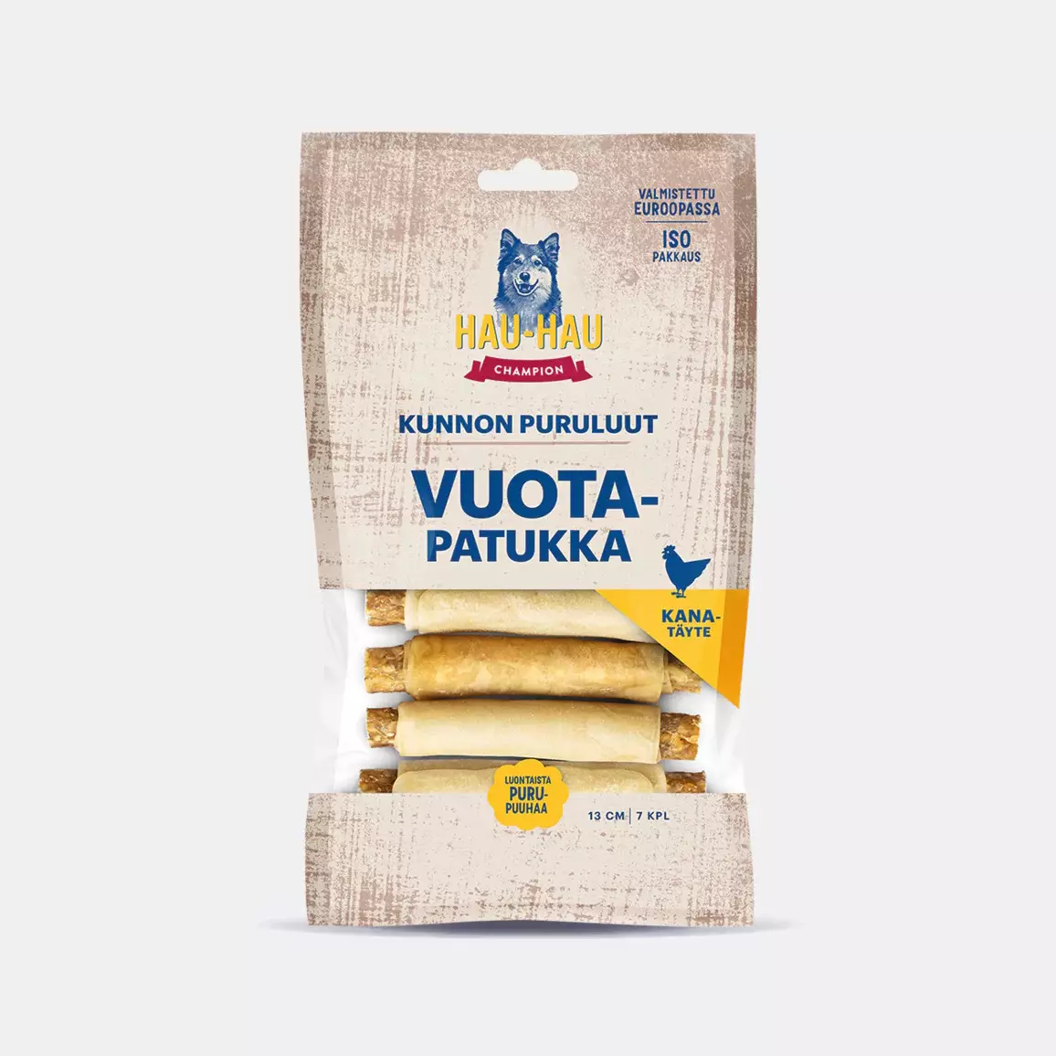 Tarjoa lajityypillistä purupuuhaa koirallesi. Hau-Hau Championin Kunnon puruluut -sarjan Vuotapatukka kana on maistuva puruluu, jonka naudannahkaisen sitkeän kuoren alle on kätketty kanaa sisältävä rouhetanko.