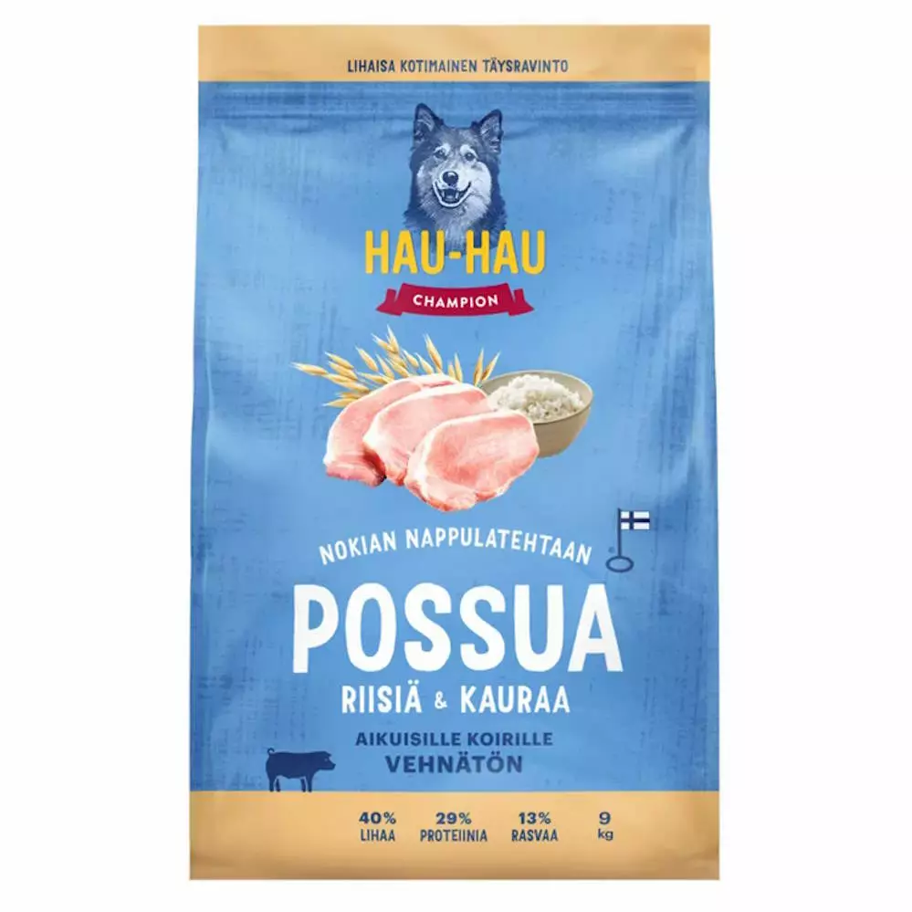 Hau-Hau Champion Possua, riisiä ja kauraa on vehnätön koiran kuivaruoka, joka on valmistettu Hau-Haun omalla Nokian Nappulatehtaalla Pirkanmaalla. Maistuva ja lihaisa täysravinto sisältää 40 % possunlihaa ja kaikkiaan 29 % proteiinia, josta 77 % on eläinperäistä. Suomalaisilla maatiloilla kasvanut possu on tämän koiranruoan ainoa eläinproteiininlähde, josta koiran elimistö saa tärkeitä rakennusaineita. Possu on myös luonnollinen B-vitamiinin lähde. Kotimainen kananrasva antaa koiralle energiaa.