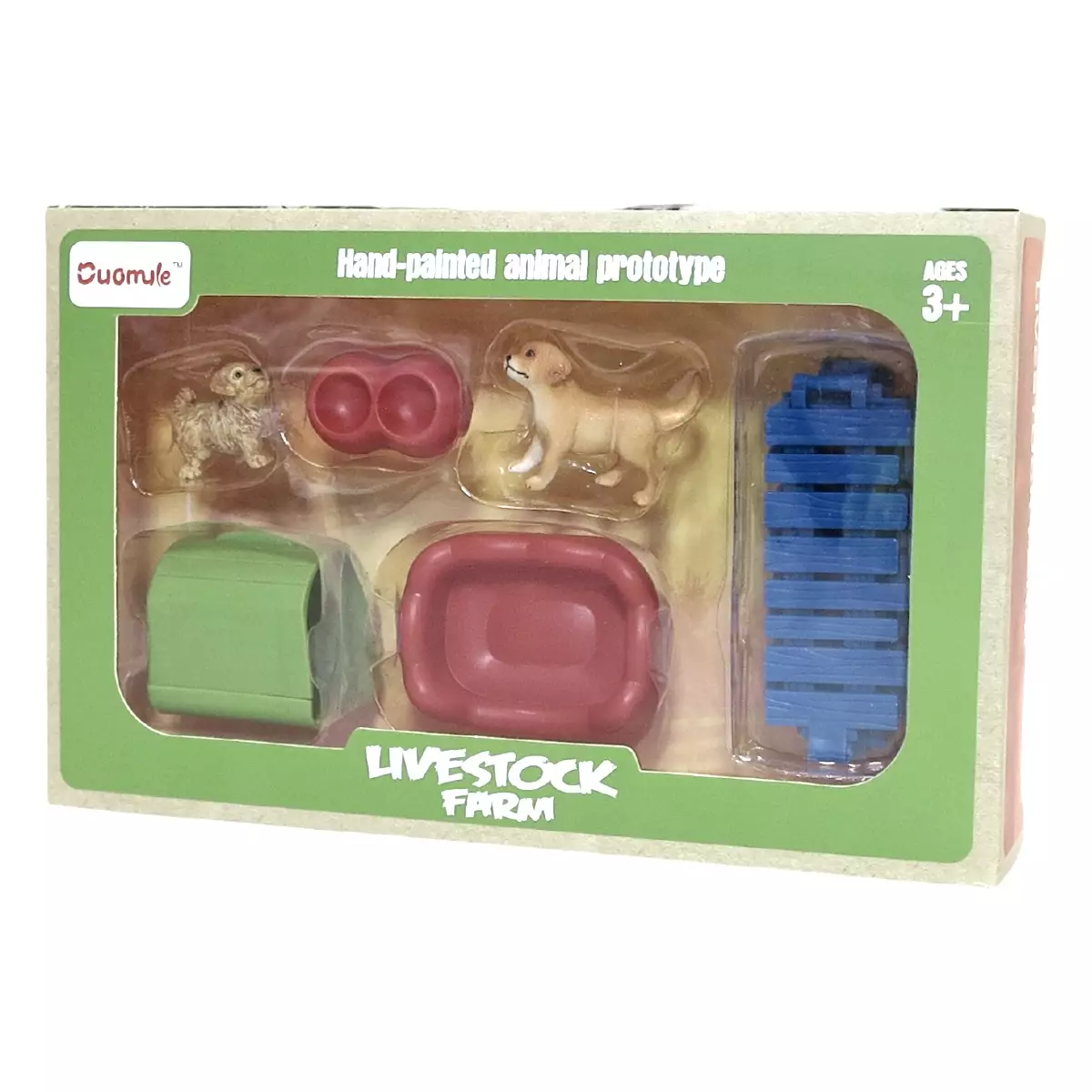 6-osainen leikkisetti jossa kaksi ihastuttavaa koiraa, aitaus, ruokakuppi, peti ja kantolaukku. Koirat käsinmaalattuja.