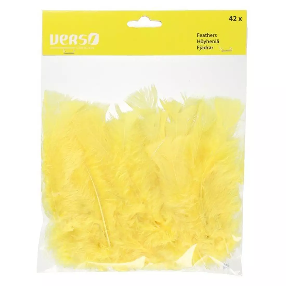 Pakkaus sisältää 42 kpl keltaisia koristehöyheniä askarteluun ja esimerkiksi pajuvitsojen ja pääsiäiskranssien koristeluun. Höyhenissä on valmiina rautalanka, mikä tekee askartelusta entistä helpompaa.