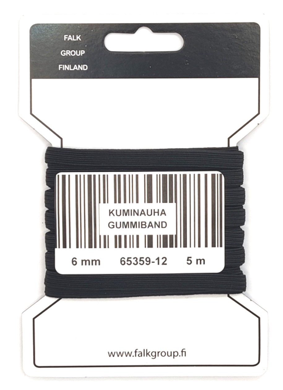 Laadukas ja joustava peruskuminauha. Voi ommella päältä tai pujottaa kujaan. Väri musta. Leveys 6 mm. Pituus 5 m. Materiaali 30 % Polypropeeeni 70 % Lateksi.