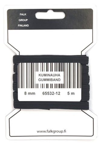 Laadukas ja joustava peruskuminauha. Voi ommella päältä tai pujottaa kujaan. Väri musta. Leveys 8 mm. Pituus 5 m. Materiaali 30 % Polypropeeeni 70 % Lateksi.