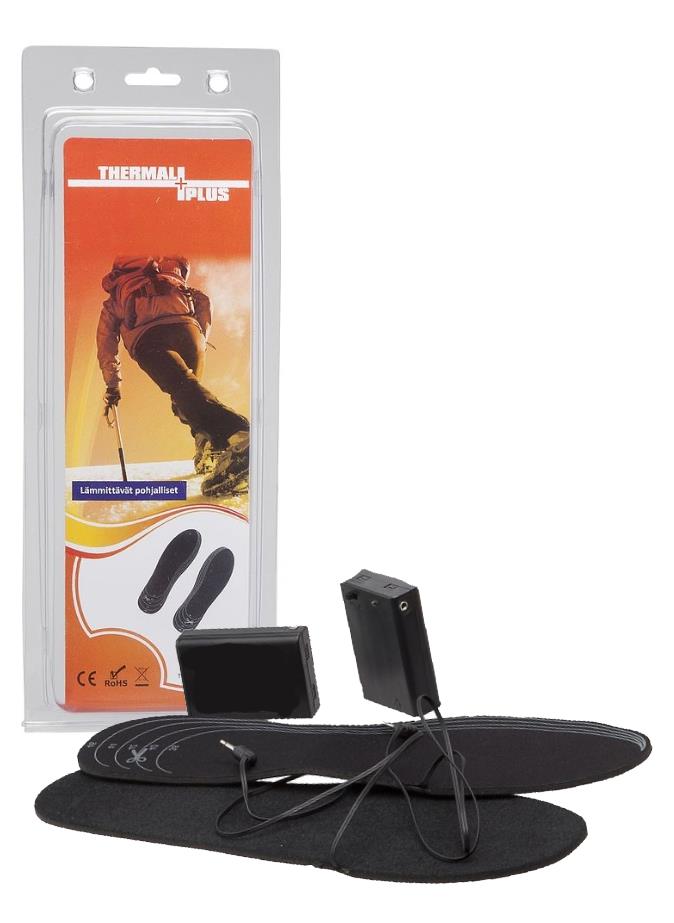 Pakkaukseen sisältyy lämmittävät pohjalliset, AA-paristokotelo ON/OFF-kytkimellä sekä taskulliset nilkkapidikkeet, joilla paristokotelot kiinnitetään nilkkoihin.