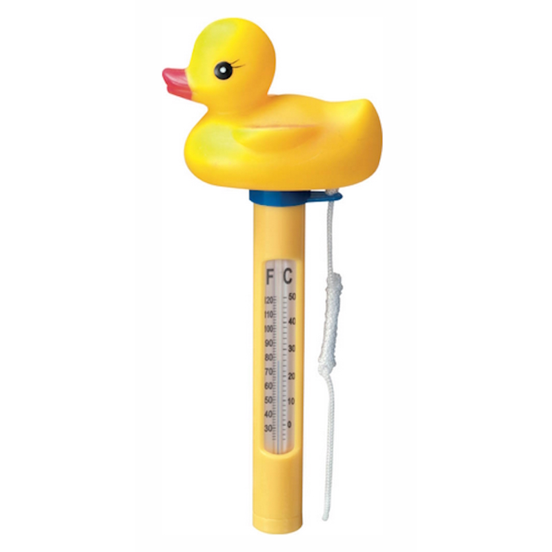 Kätevä ja koristeellinen lämpömittari, jonka pehmeä kelluva osa on muotoiltu klassiseksi kylpyleluksi - keltaiseksi ankaksi. Lämpömittari kelluu ympäri allasta. Kätevän narun ansiosta lämpömittarin saa kiinni helposti – sido naru vaikka uimatikkaisiin. Kaksi lämpötila-asteikkoa näyttää lämpötilan Celsius- (-6 - +50 astetta) Fahrenheit- (22 - 120) asteina.