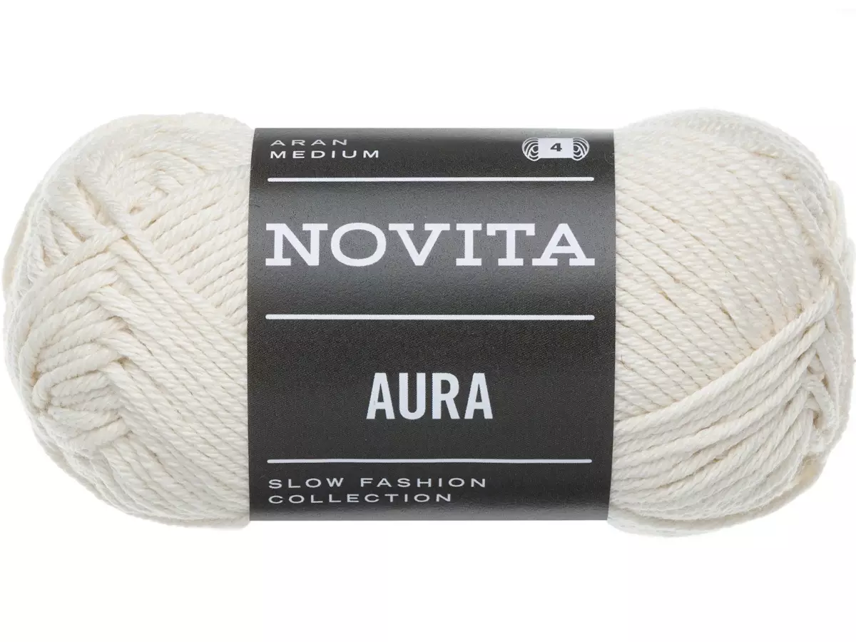 Novita Aura on 100 % puuvillalanka, joka sopii monipuolisesti sekä virkkaukseen että neulontaan. Napakasta puuvillalangasta valmistuu nopeasti sekä sisustustuotteet että asusteet, kuten virkatut kassit ja hatut. Paksu puuvillalanka sopii etenkin aloitteleville virkkaajille. Aura -langasta tehdyt tuotteet voidaan konepestä 40 asteessa ja sen valmistukselle on myönnetty Oeko-tex® STANDARD 100 -tuoteturvallisuusmerkki. 50 gramman kerässä on 80 metriä lankaa. Puikko- ja koukkusuositus langalle on 4–5.