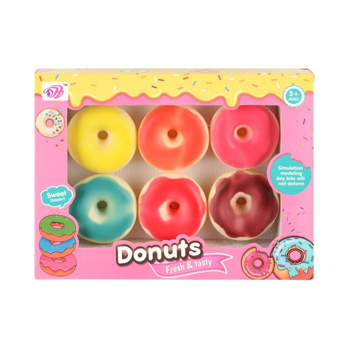 Setissä 6 värikästä donitsia kotileikkeihin. Ikäsuositus 3+.