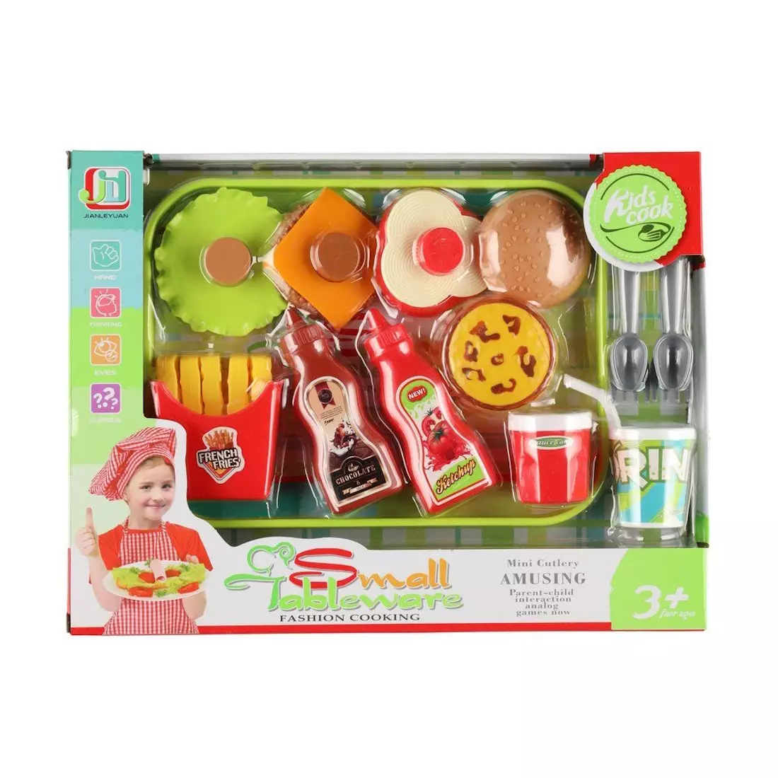 Setissä tarjotin, leikkiruokia ja juomapullo. Ikäsuositus 3+.