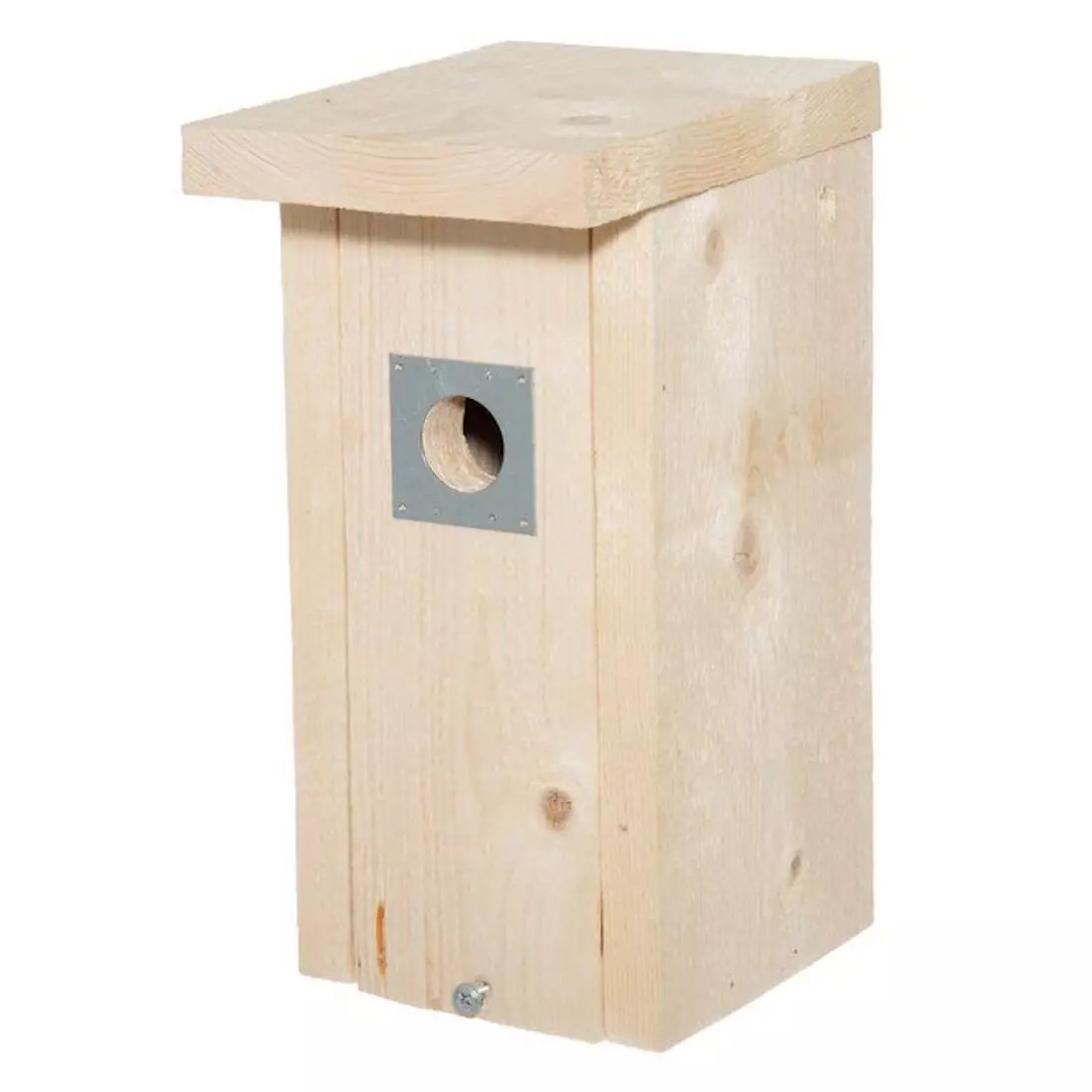 Kotimainen linnunpönttö 32 mm lentoaukolla. Valmistettu kuusilaudasta. Lentoaukon suojapelti tulee pöntön mukana. Avattava etuosa, joten puhdistus onnistuu helposti. Sivuilla reijät narukiinnitystä varten.