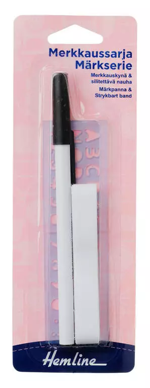 Monipuolinen sarja kangasmerkintään. Sisältää merkkauskynän ja silitettävän nauhan.