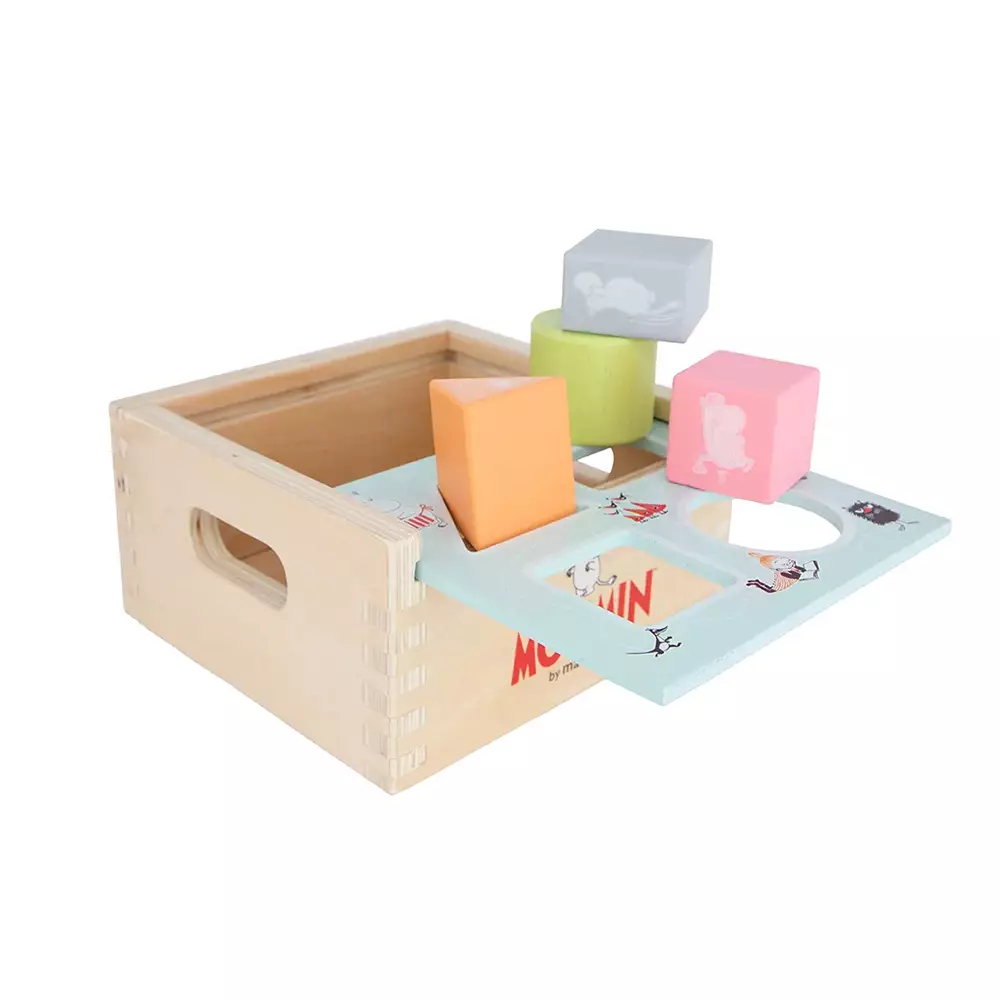 Laatikon kannessa seikkailevat tutut Muumilaakson hahmot, ja sen pastellisävyinen ulkoasu tekee siitä iloisen ja lempeän näköisen leikkikaverin. Mukana tulevat neljä eriväristä ja -muotoista puupalikkaa: kolmio, suorakulmio, neliö ja ympyrä. Jokainen niistä tipahtaa laatikkoon vain omasta aukostaan – täydellinen yhdistelyharjoitus pienille käsille!