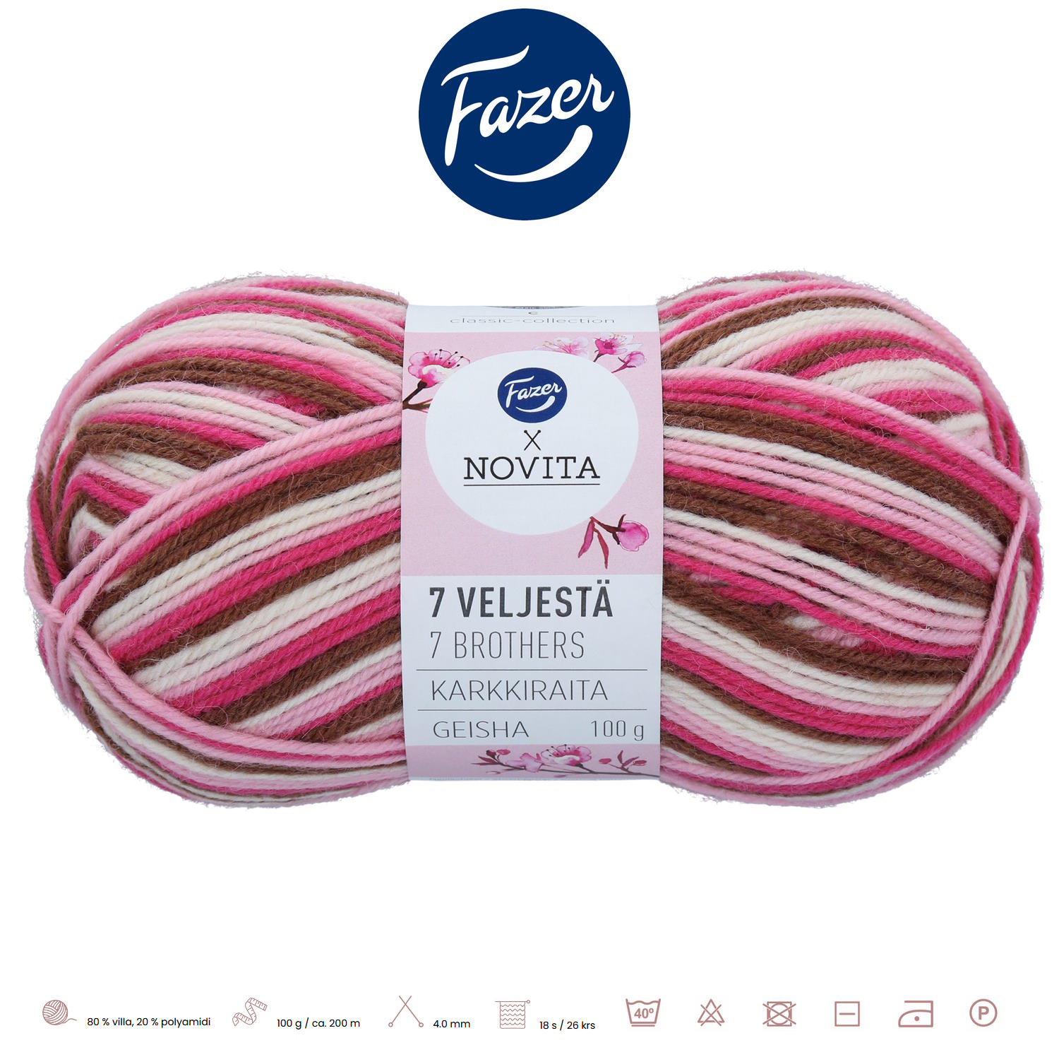 Fazer x Novita -yhteistyönä toteutetussa 7 Veljestä Karkkiraita -langassa yhdistyvät kaksi suomalaisten rakastamaa klassikkoa: ikoninen 7 Veljestä -sukkalanka ja Fazerin makeiset.