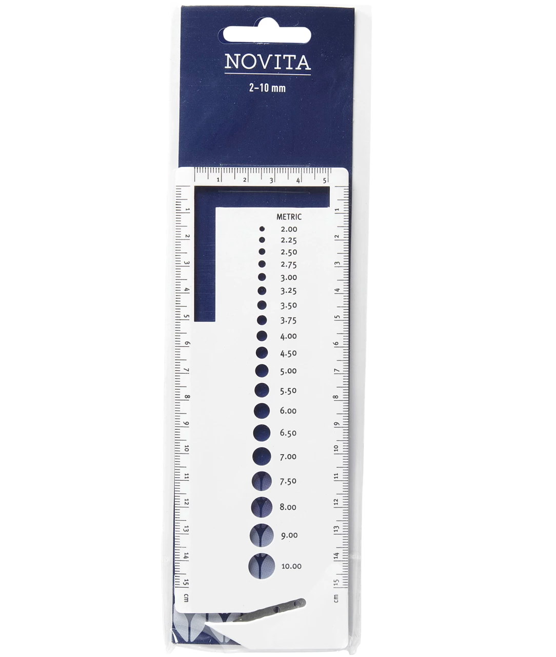 Novita Puikkomittarin avulla tarkistat helposti neulepuikkojen oikean koon. Mukana myös kätevä lankaleikkuri sekä senttimitta reunassa. Mitat sopivat puikoille 2 mm - 10 mm.