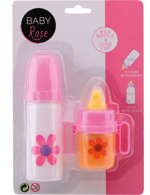 Pakkauksessa maito- ja mehupullot, joista voit antaa vauvanukellesi juotavaa. Alaspäin kallistettuna pullot ”tyhjenevät” ja pystyasennossa ne ”täyttyvät”. Pidemmän pullon pituus 15 cm. Ikäsuositus 3+ vuotta. Merkki: Baby Rose.
