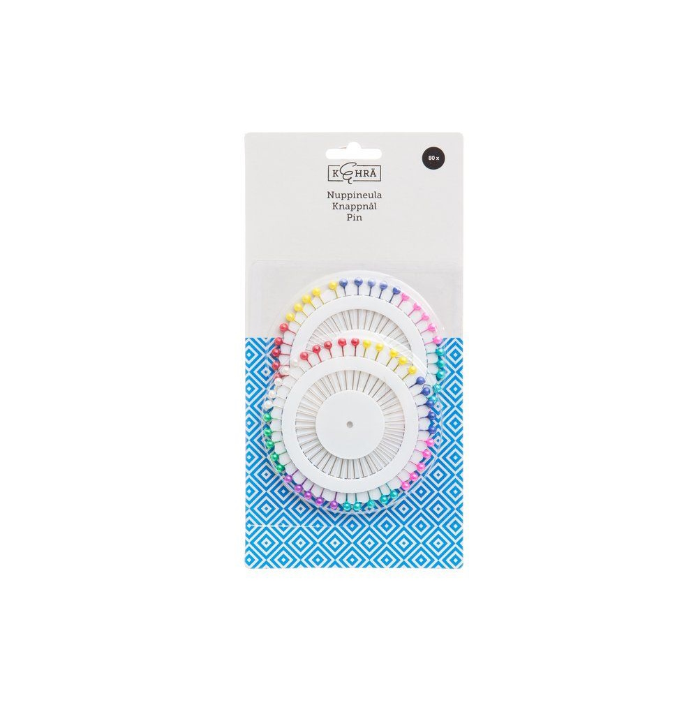 Hiiliteräksestä valmistetut nuppineulat värikkäillä nupeilla. Helppo säilyttää.