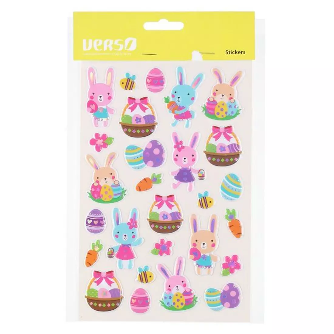 Suloiset pääsiäisteemaiset tarrat esimerkiksi korttiaskarteluun ja kalentereihin. Pakkaus sisältää yhden tarra-arkin. Materiaali PVC.