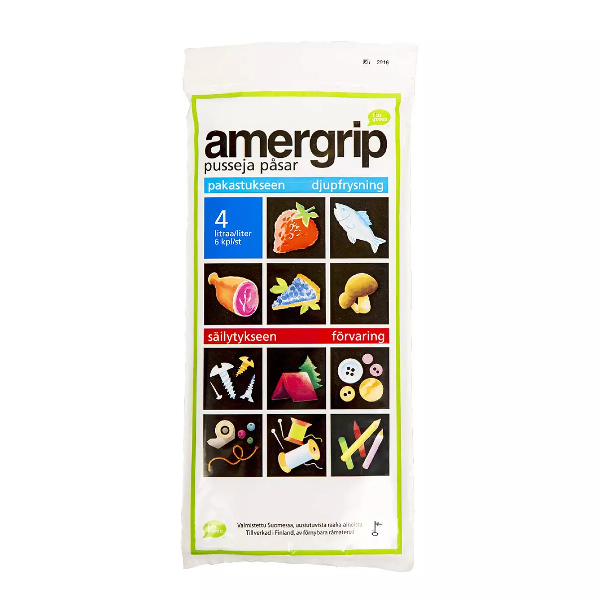 Uudelleensuljettava Amergrip pussi pakastukseen ja säilöntään. Pussi on helppo avata ja sulkea, ja suljin on tiivis myös nesteille. Valkoinen kirjoitustausta on painettu pusseihin valmiiksi, mikä helpottaa sisällön merkitsemistä. 4 litran koko sopii suuremmille annoksille ja muille pakastettaville elintarvikkeille. Pussit valmistetaan Tampereella, ja niille on myönnetty Suomalaisen Työn Liiton Avainlippu-merkki.