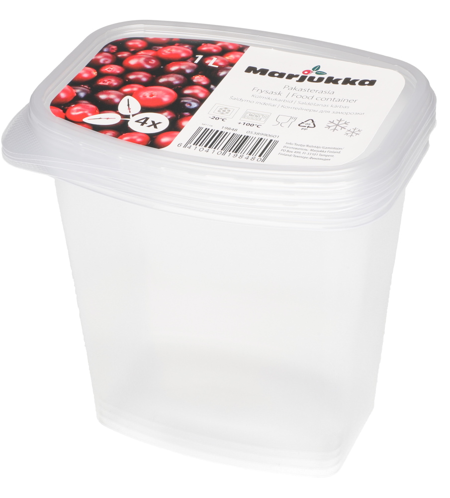 Marjukka 1 l pakastusrasia, uudet kannet huonoja, liian lyhyt reuna nykyään. Ennen noin 1/2 cm korkeampi. Pysyi paremmin rasiassa kiinni.