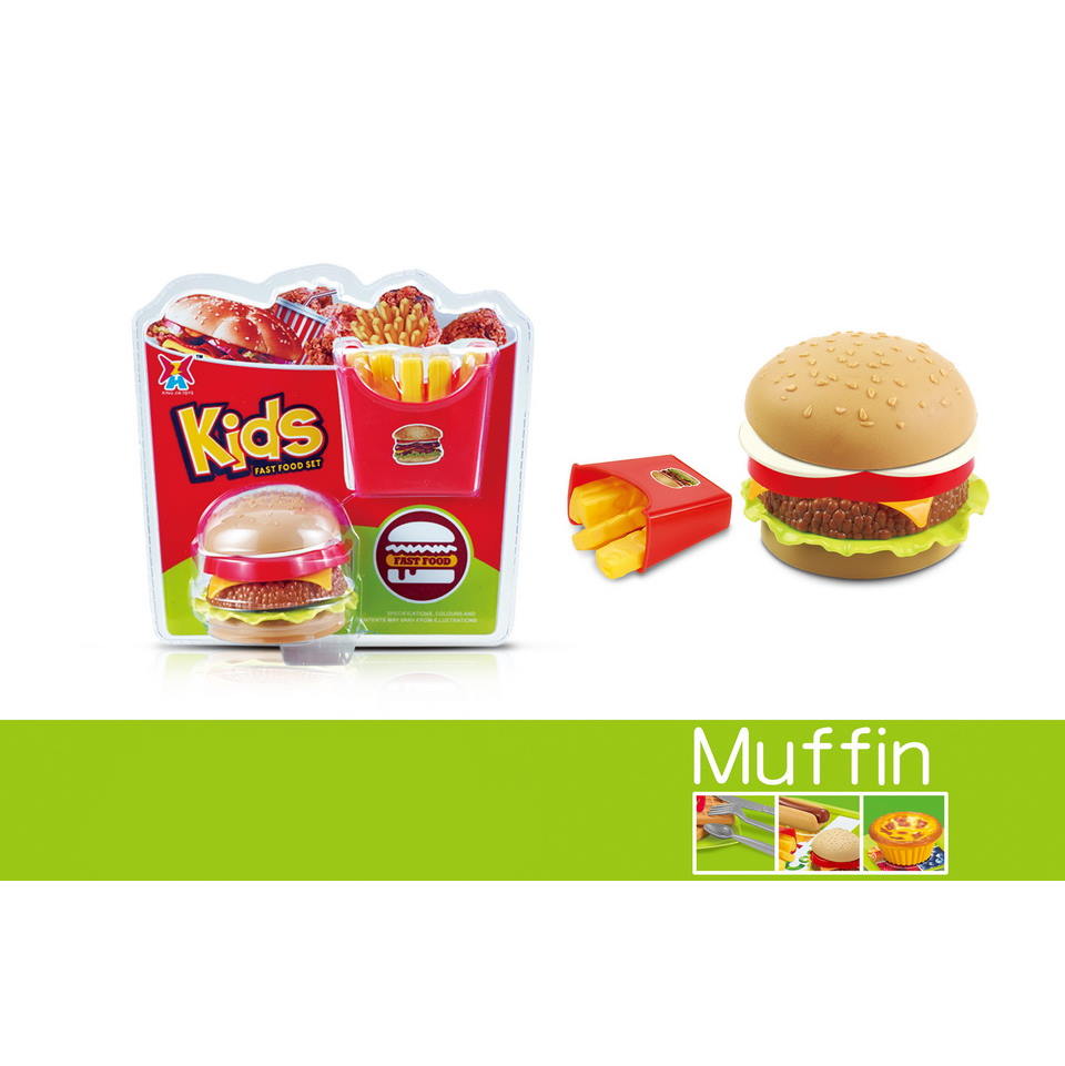 Hauska 13-osainen leikkisetti, jolla valmistat hetkessä komean hampurilaisaterian. Kokoa burgeri oman maun, tai asiakkaan toivomusten mukaan. Lisää vielä ranskalaiset perunat ja ateria on valmis. Tuotteen mittatiedot: 19,5 x 19 x 9,5 cm – 0,112 kg.