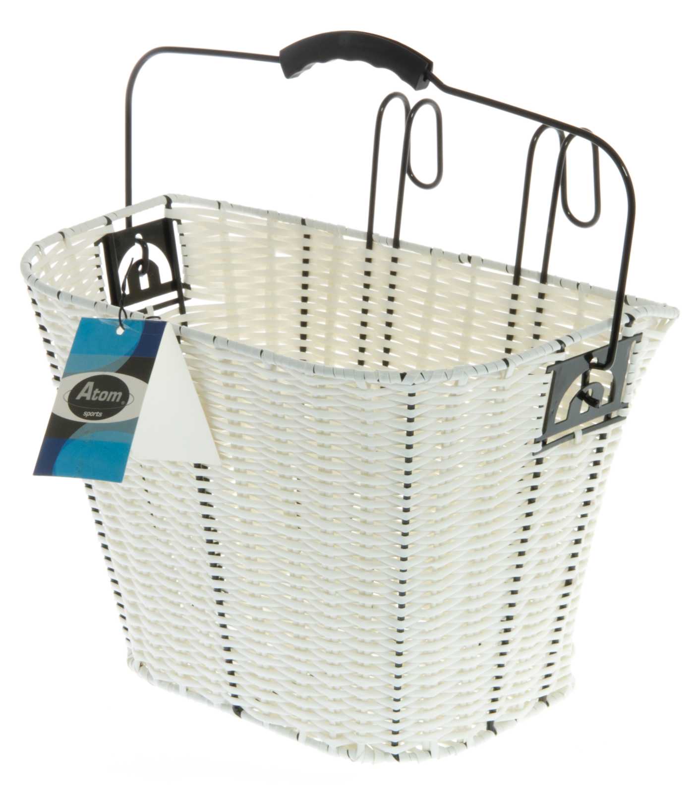 Kestävästä valkoisesta muovirottingista valmistetun pyöränkorin voit tarpeen tullen myös ottaa avuksi vaikka kauppaan ostoksille siinä olevan kantokahvan ansiosta.