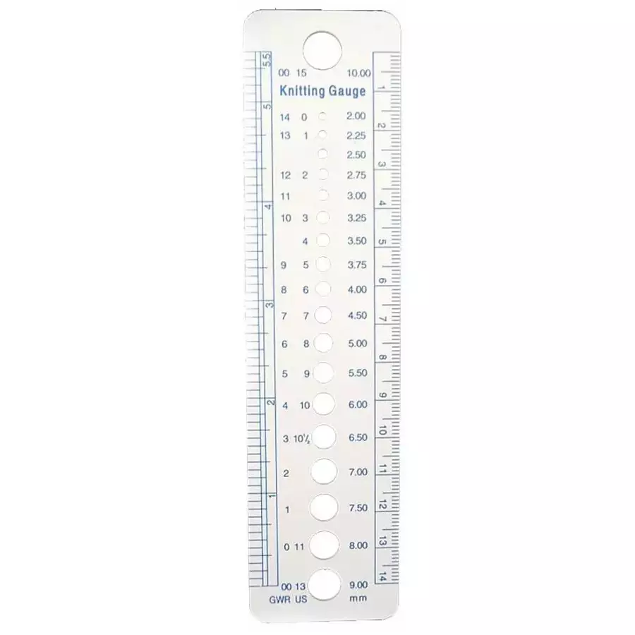 Muovinen puikkomittari ja samalla viivain senttimetrillä ja tuumilla. Puikkokoot 2.00 mm - 9.00 mm.