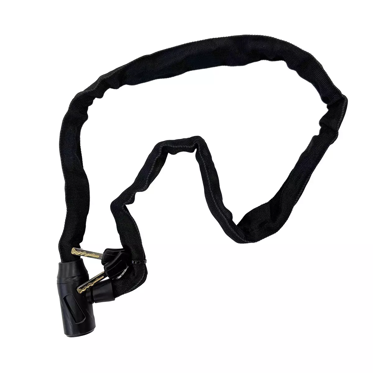Pitkä ja kestävä ketjulukko polkupyörän turvalliseen lukitsemiseen. 1200 mm pituus antaa joustavuutta ja helpottaa pyörän kiinnittämistä telineeseen, tolppaan tai muuhun kiinteään kohteeseen. Kangaspäällyste suojaa pyörän runkoa naarmuilta ja lisää käyttömukavuutta. Lukkopesässä on avaimenreiän suojus, joka auttaa suojaamaan lukitusmekanismia lialta ja kosteudelta. Mukana toimitetaan kaksi avainta.