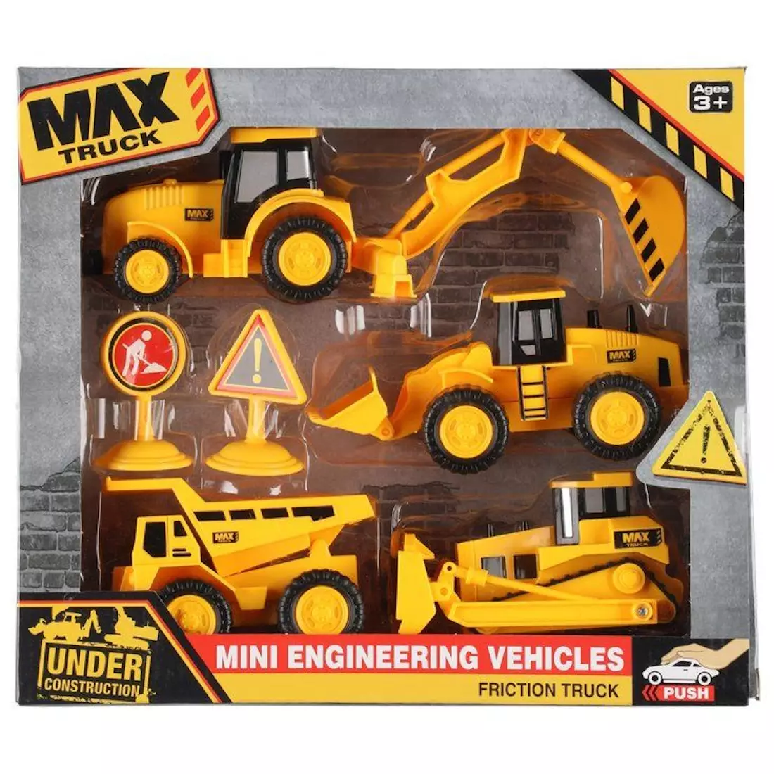 Leikkisetissä 4 työmaa-ajoneuvoa ja kaksi liikennemerkkiä. Ikäsuositus 3+.