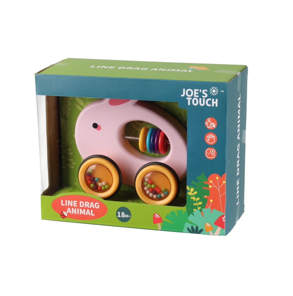 Vedettävä pupu leikki-ikäiselle taaperolle ja lapselle. Vedettävässä lelussa on lapsen käteen sopiva vetonaru ja pyörissä on kumiset pehmikkeet. Kumiset pehmikkeet pyörissä vähentävät melua.