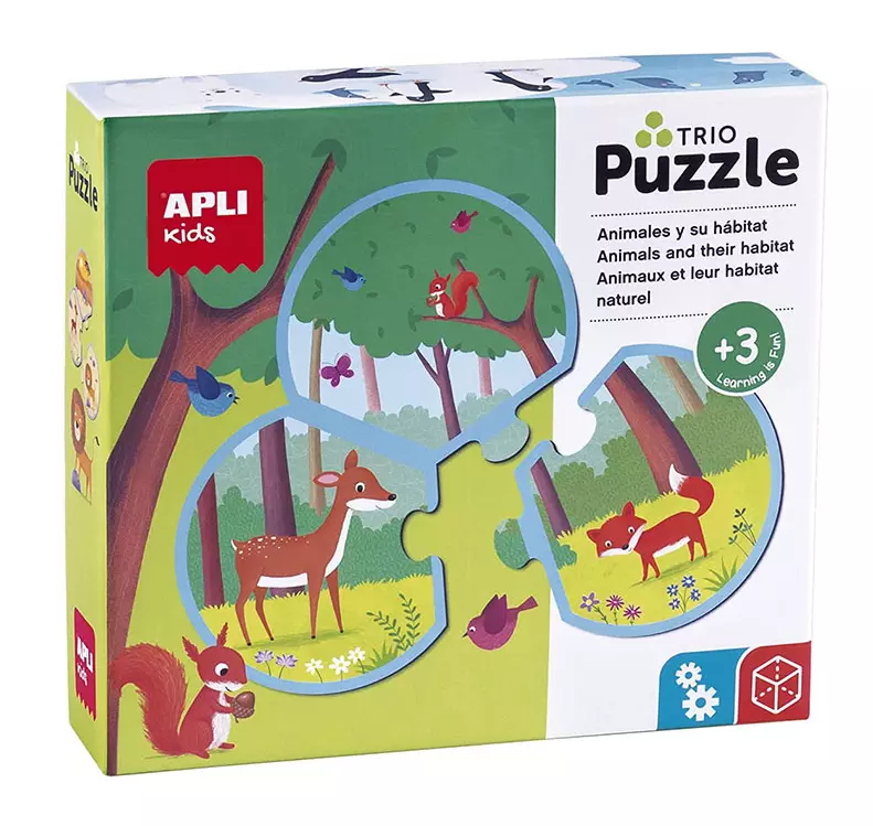 Kahdeksan kolmipalaista palapeliä erilaisin eläinaihein. Tavoitteena yhdistää oikeat eläimet oikeaan elinympäristöön. Ikäsuositus 3+. Palojen halkaisija n. 8,5 cm.