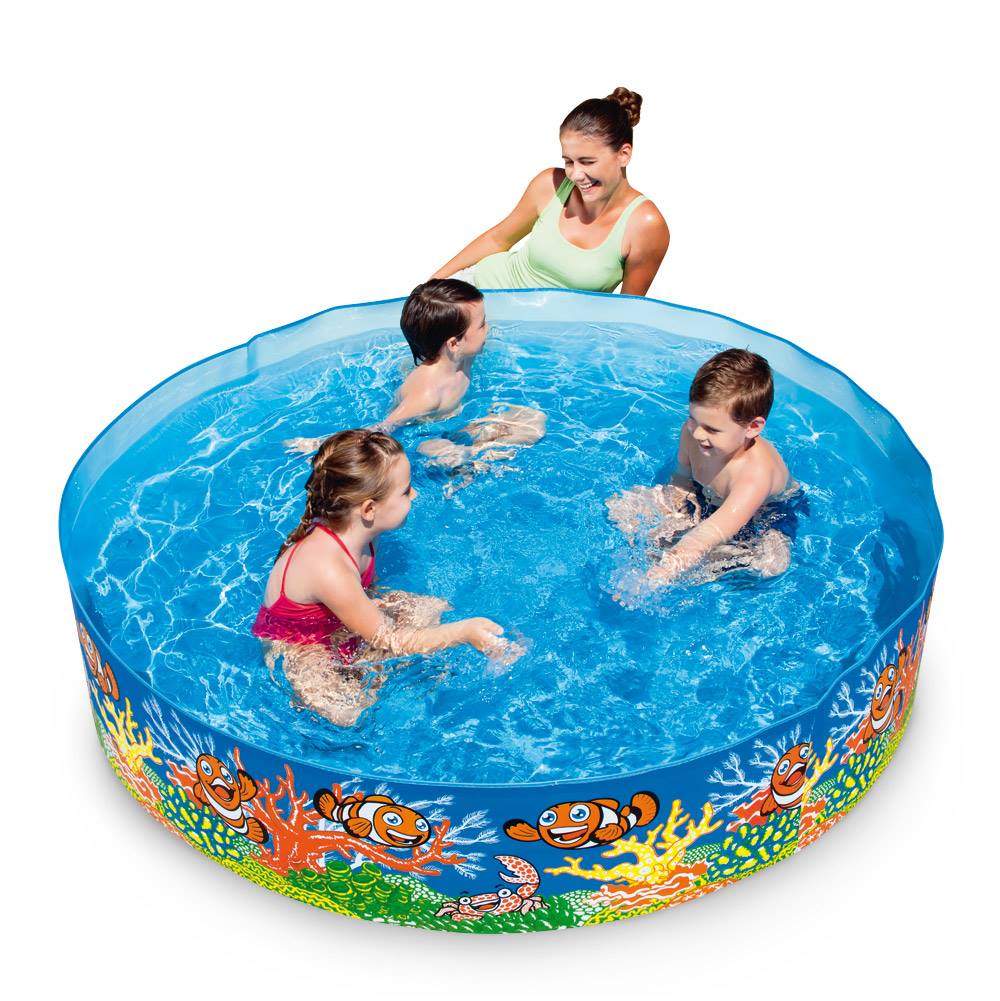 Rulla-allas, jossa jäykkä PVC-seinämä ja vahva vinyylipohjakangas. Hauska vesieläinkuviointi. Mukana korjauspaikka.