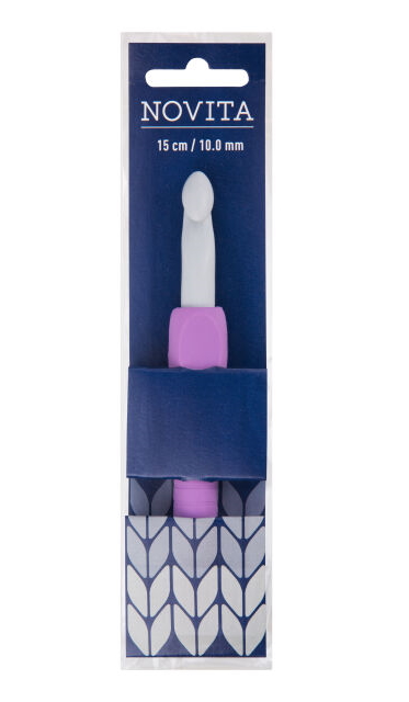 Novita ergonominen virkkuukoukku (15 cm) on suunniteltu siten, että kädensijasta saa hyvän ja pitävän otteen. Paksumpi muotoiltu varsi vähentää puristusta koukusta, jolloin käden ja käsivarren lihakset pysyvät rennompina. Varsi on muovia ja koukkuosa alumiinia. Koukun koko on 10.00 mm.
