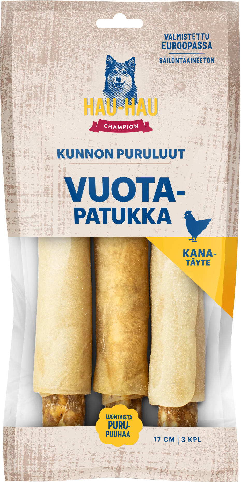 Kunnon puruluut -sarjan Vuotapatukka kana on herkullinen naudannahkaluu, jonka sitkeän kuoren sisältä löytyy kanaa sisältävä rouhetanko. Pureskelu on koiralle luontaisesti mieluisaa ja hampaita puhdistavaa puuhaa. Kestävä Vuotapatukka pitää koiran hyvin aktivoituna, jolloin sallit lemmikillesi tärkeän oman hetken.